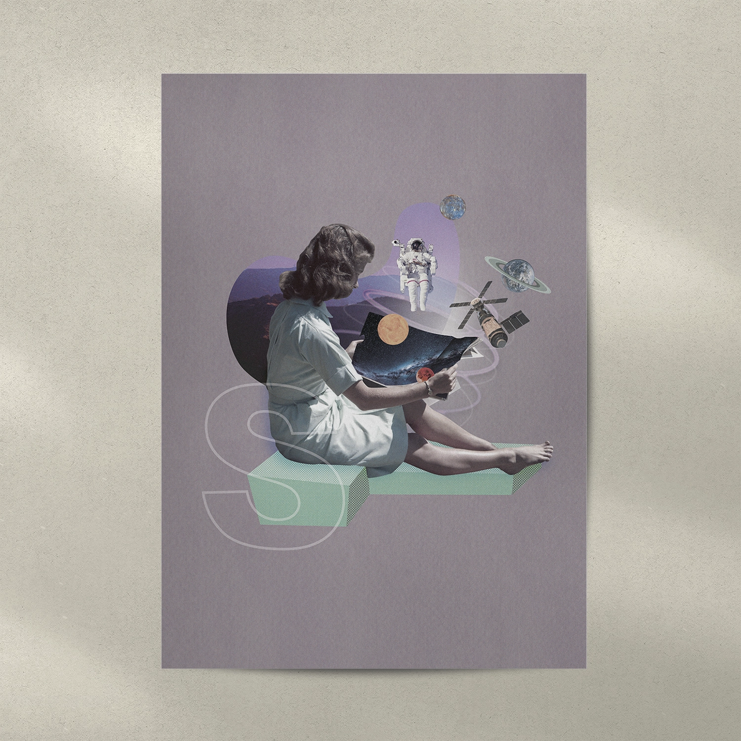 Collage digital de una chica observando el universo en un magazine.